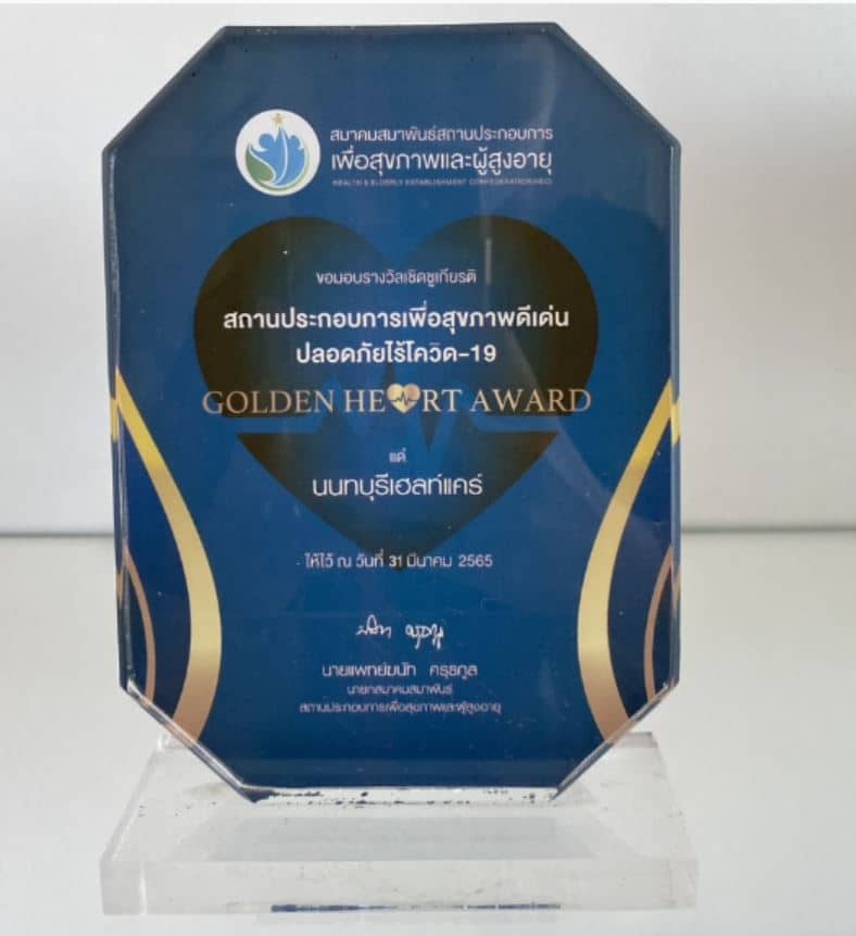 รางวัลสถานประกอบการเพื่อสุขภาพดีเด่นปลอดภัยไร้โควิด-19 “Golden Heart Award” โดย สมาคมสมาพันธ์สถานประกอบการเพื่อสุขภาพและผู้สูงอายุ ยืนยันมาตรฐานด้านความปลอดภัยและระบบป้องกันโรคที่เข้มงวด